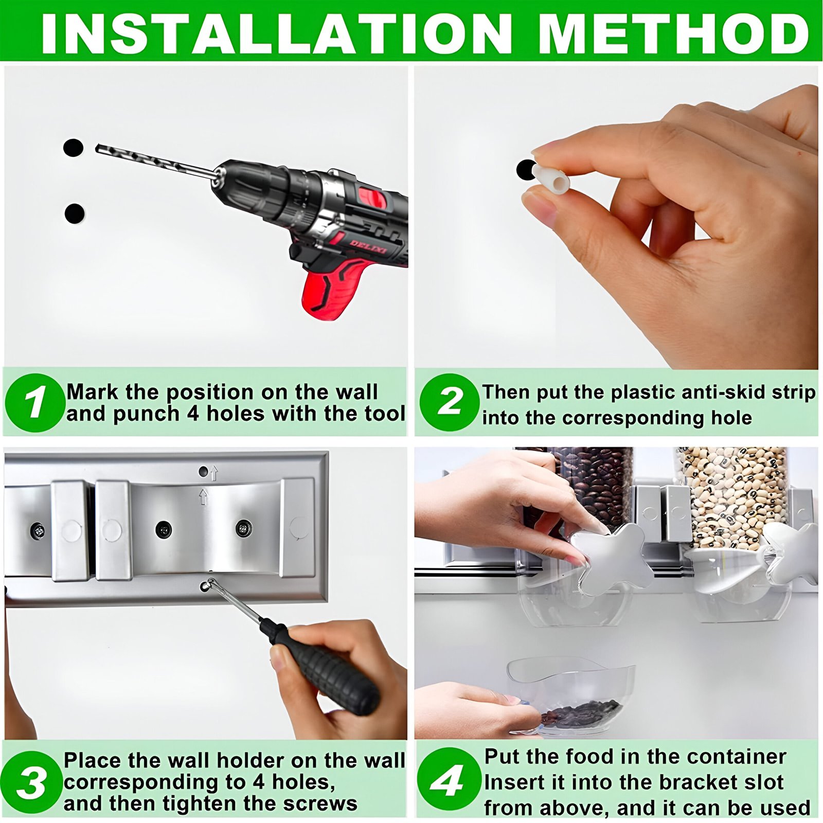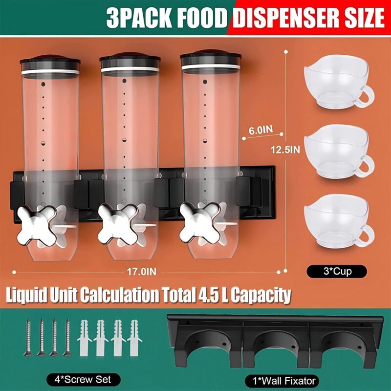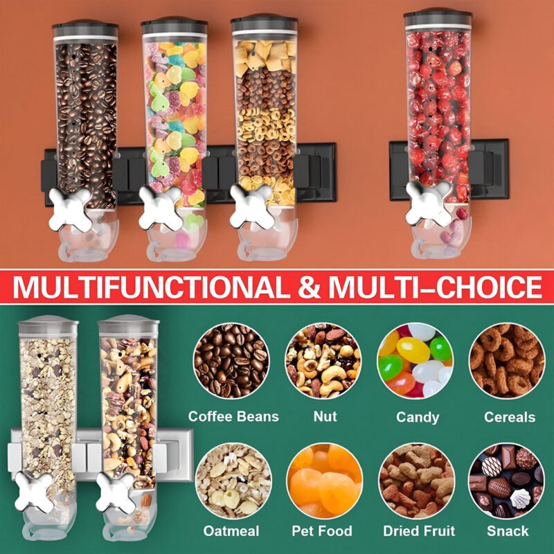 - Wall-Mounted & Space-Saving: The wall-mounted design keeps the dispenser stable and helps save counter space. The individual canisters are easy to remove for filling and cleaning.