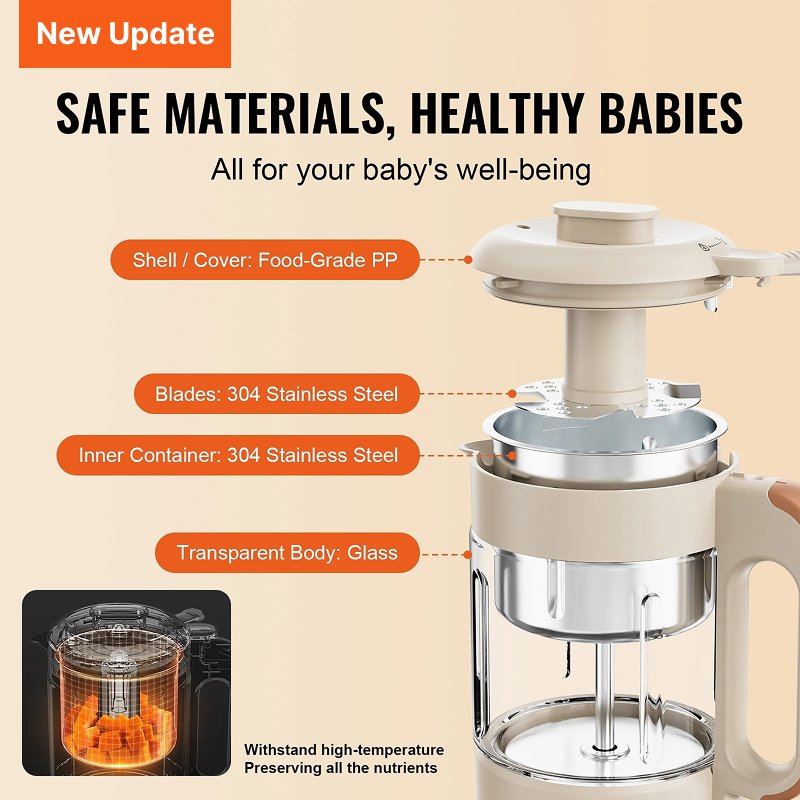 - 4-Blade System: The powerful 4-blade cutting system ensures that all ingredients, from soft fruits to tough vegetables, are blended and pureed to the perfect consistency for your baby.