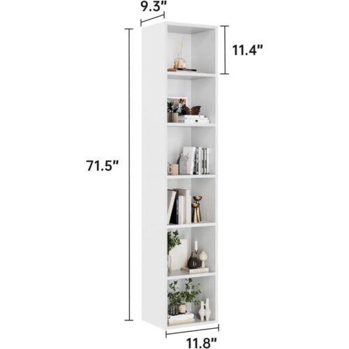 Standing at 71.5″ tall with a slim 9.3″ depth and 11.8″ width, this bookshelf is designed for tight spaces while offering ample storage. Its tall and narrow shape allows you to create an organized display without taking up too much floor space. Arrange books, decorative items, potted plants, or even kitchen essentials for a clean and stylish look.