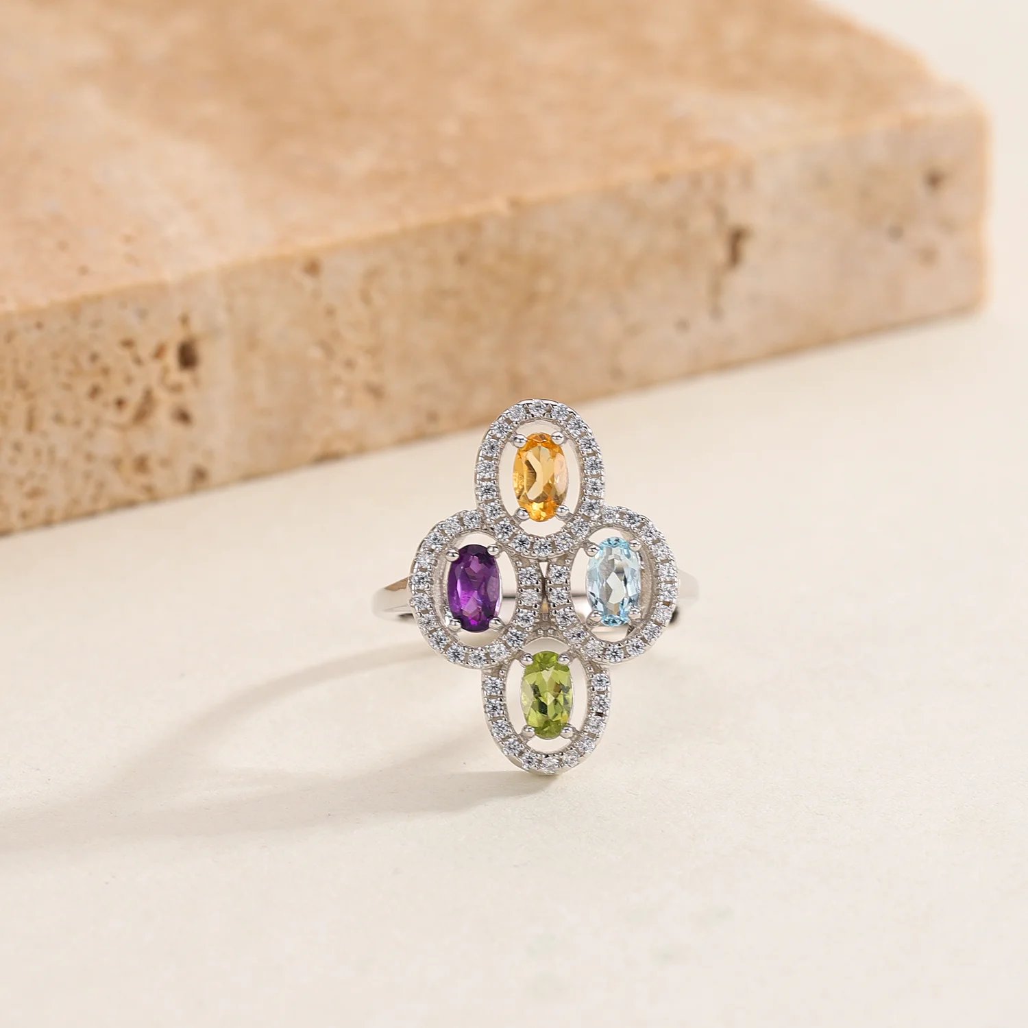 925 Sterling Silver Clover Flower Ring with Natural Amethyst, Peridot, Topaz & Citrine