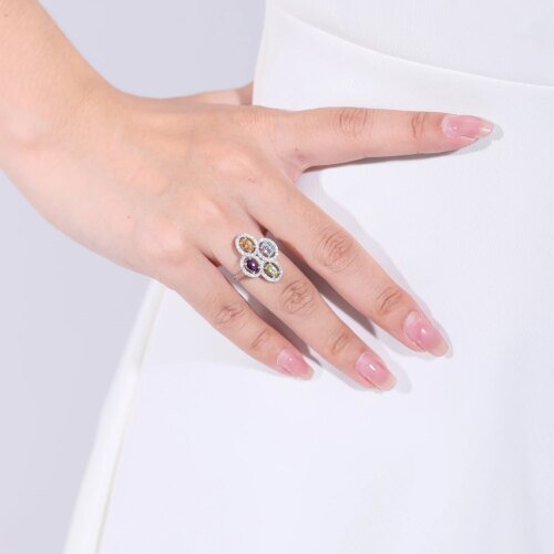This stunning 925 sterling silver clover flower ring combines the beauty of nature with timeless elegance. Designed for the modern woman, it features vibrant natural gemstones—Amethyst, Peridot, Topaz, and Citrine—each symbolizing a different birthstone. The prong setting showcases these exquisite stones, making it a statement piece perfect for any special occasion, especially a glamorous party or celebration.