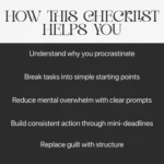 This checklist is for students, creatives, entrepreneurs, professionals, and anyone tired of endlessly delaying important tasks. If you’ve ever thought, “I’ll do it later” and then felt guilty for not starting, this is for you. It’s perfect for people who want clarity without complicated systems, and progress without burnout.