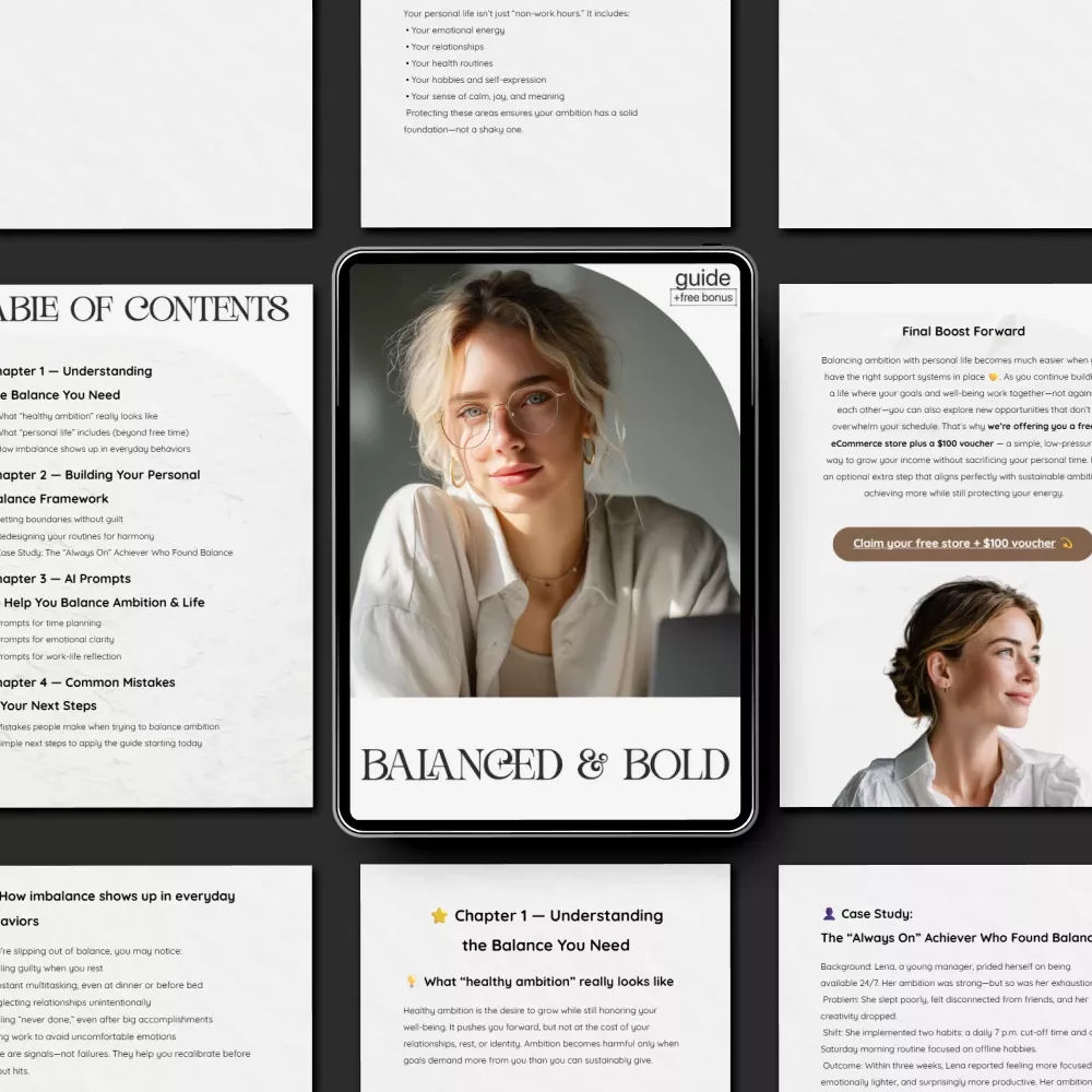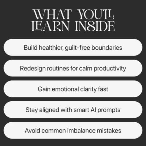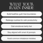 - Chapter 3 — AI Prompts to Help You Balance Ambition & Life: Time planning prompts, emotional clarity prompts, and reflection prompts that guide your daily decisions.