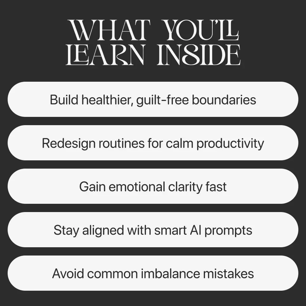 - Chapter 2 — Building Your Personal Balance Framework: Learn how to set boundaries without guilt, redesign your routines, and explore a real-life case study of an “Always On” achiever who found harmony.