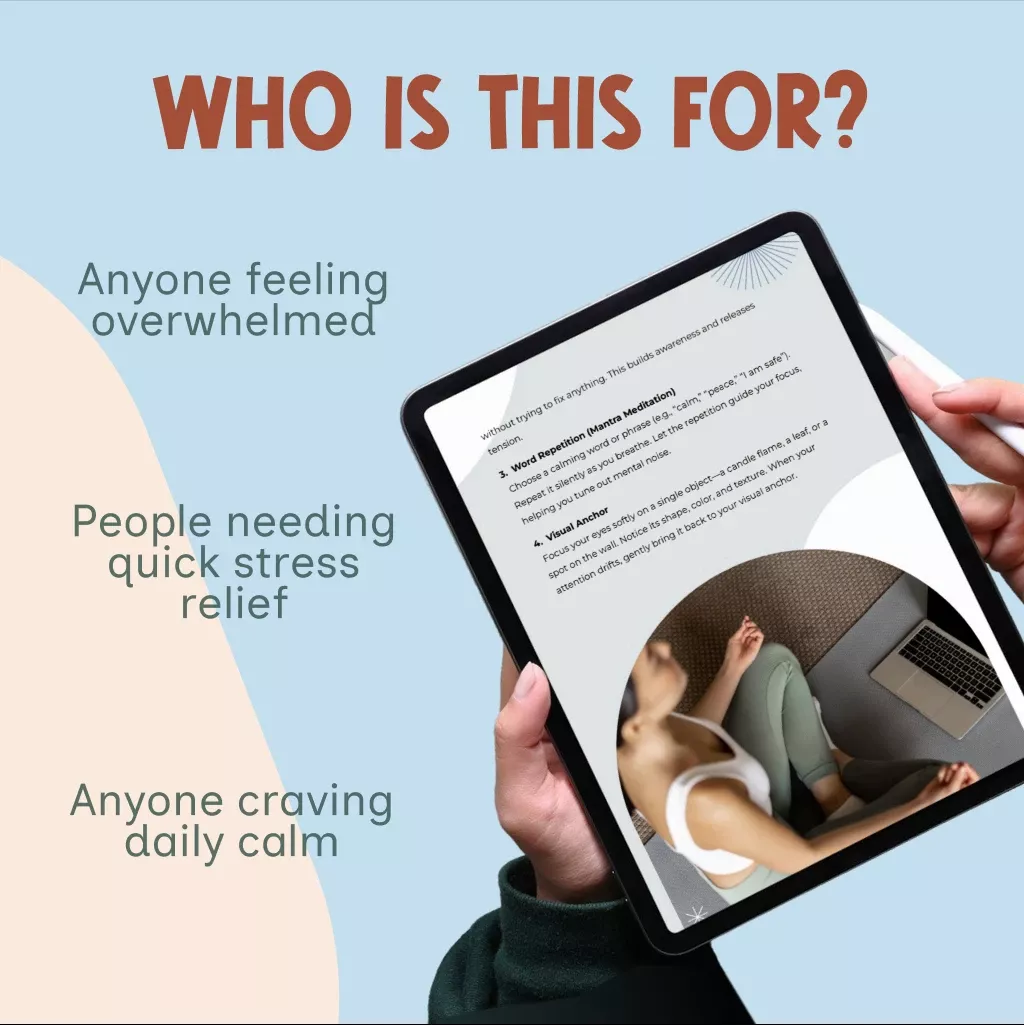 Unlike other generic resources, this informative guide brings together actionable breathing exercises, quick meditations, grounding techniques, and time management tips to reduce stress—all in one calming, easy-to-follow format. It’s more than information—it’s transformation in your back pocket.