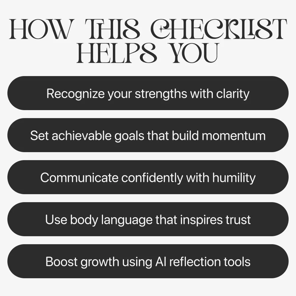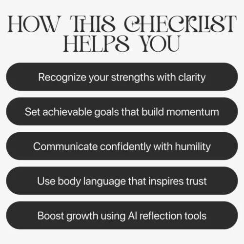 This checklist is ideal for anyone who wants to feel more confident while remaining kind, humble, and genuine. Whether you’re preparing for life transitions, improving relationships, or simply growing self-awareness, this guide gives you the structure and encouragement to believe in yourself without feeling the need to prove it.