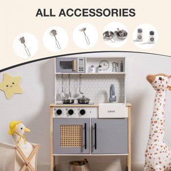 The Classic Gray Wooden Play Kitchen Set is built to withstand years of active play. Made from durable MDF and premium wood, it’s a sturdy, safe, and secure option for your child’s playtime. The ample storage space, including a top microwave and large cabinet, allows children to organize their kitchen accessories and keep their play area tidy.