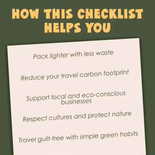 Perfect for frequent flyers, backpackers, digital nomads, eco-tourists, and anyone who wants to explore responsibly. Whether you’re planning a weekend getaway or a month-long adventure, this checklist helps you make meaningful, planet-friendly decisions every step of the way.