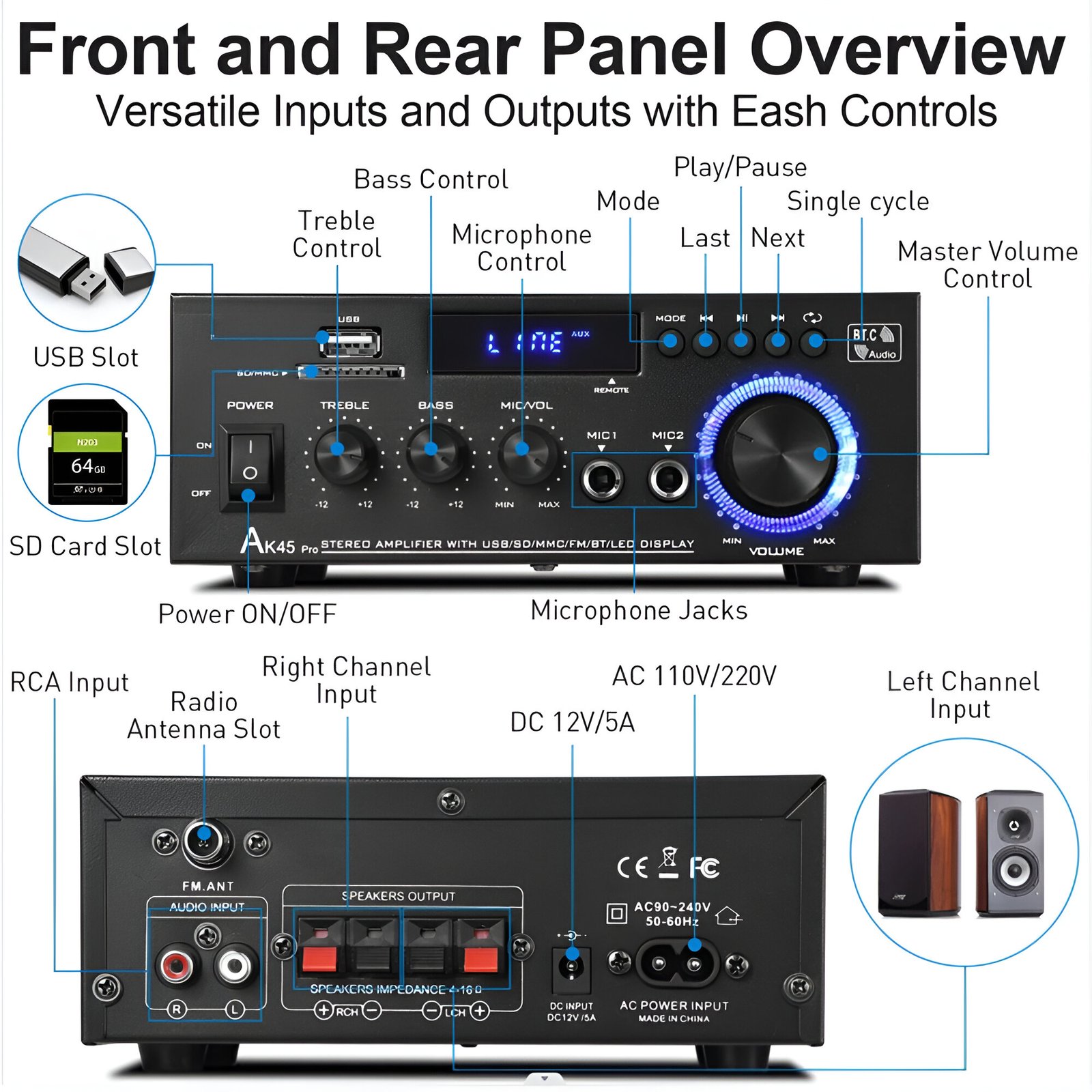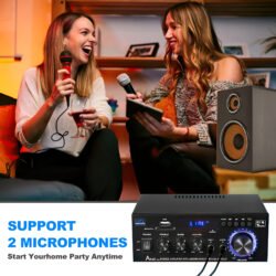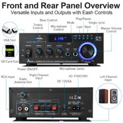 Compact yet packed with features, it supports Bluetooth, AUX, USB, TF card, SD card, FM radio, and even dual microphone inputs, making it an all-in-one solution for your entertainment setup. With its sleek black design and easy-to-use front controls for treble, bass, and volume, this amp looks as good as it sounds.