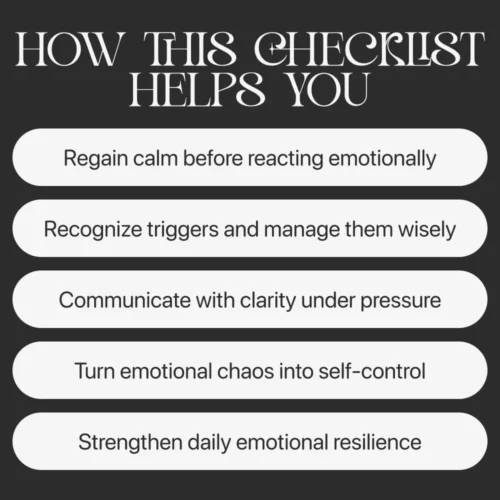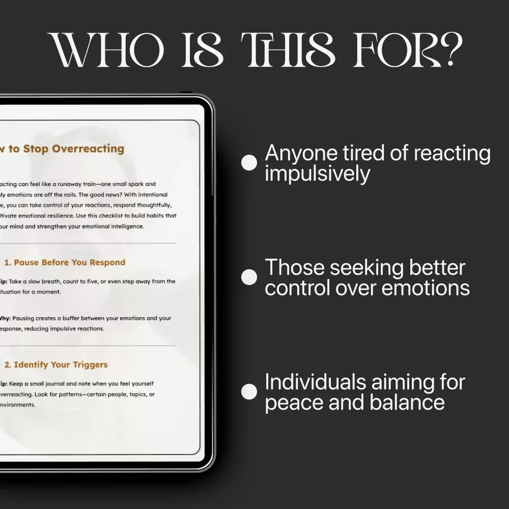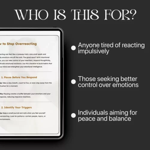 This digital checklist is perfect for anyone wanting to manage emotions better—whether you’re a parent, student, partner, or simply someone ready to take control of overreactions. It’s for people seeking everyday strategies that actually work, without needing a lengthy course or complex system.