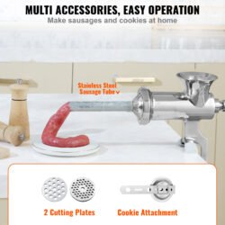 - Multi-Purpose Attachments: Includes 5mm & 8mm grinding plates, sausage stuffer tube, cookie press, push rod, and cutting blade.