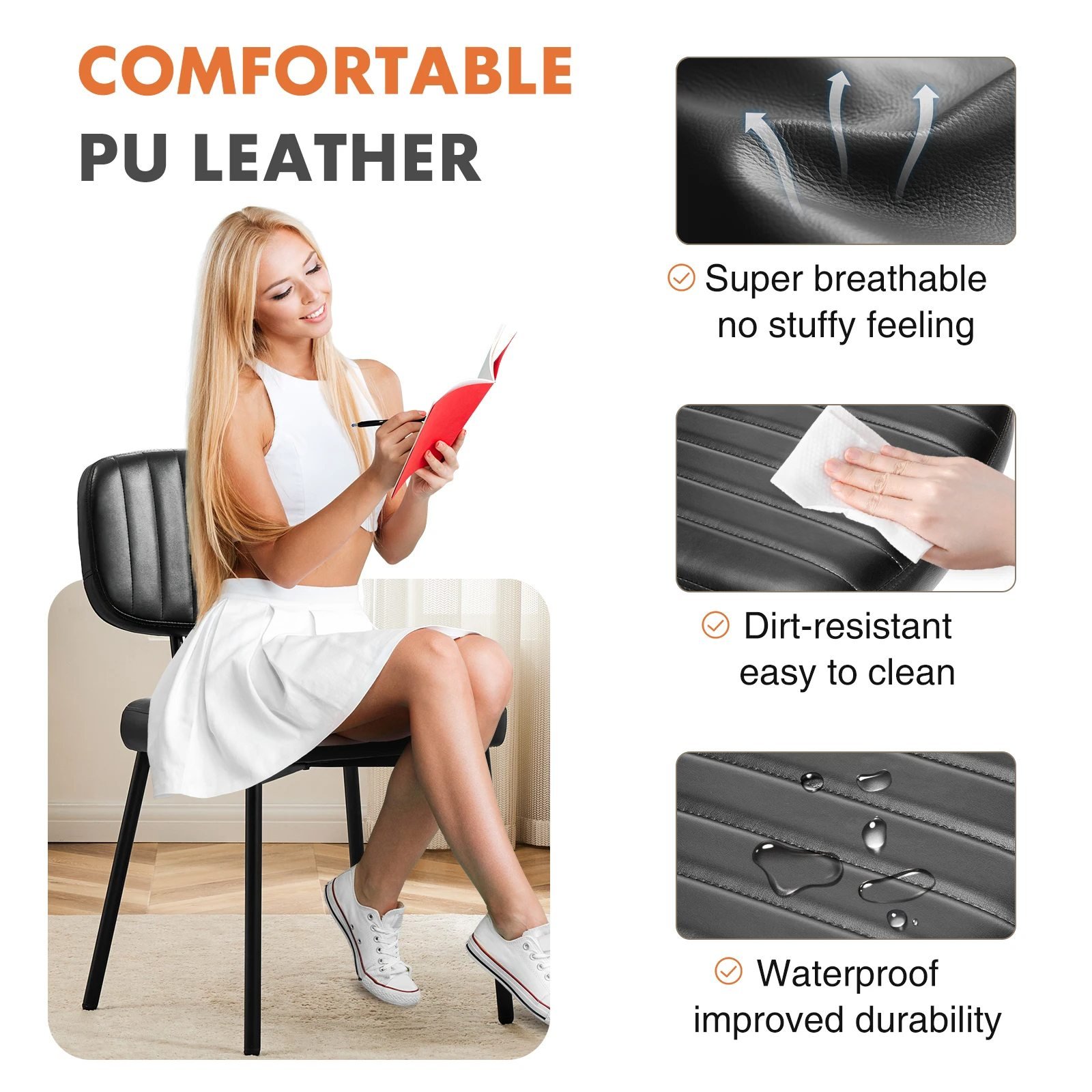 - Waterproof PU Leather: The easy-to-clean PU leather seat is not only stylish but also practical. Simply wipe it down to keep your chairs looking brand new, making maintenance effortless.
