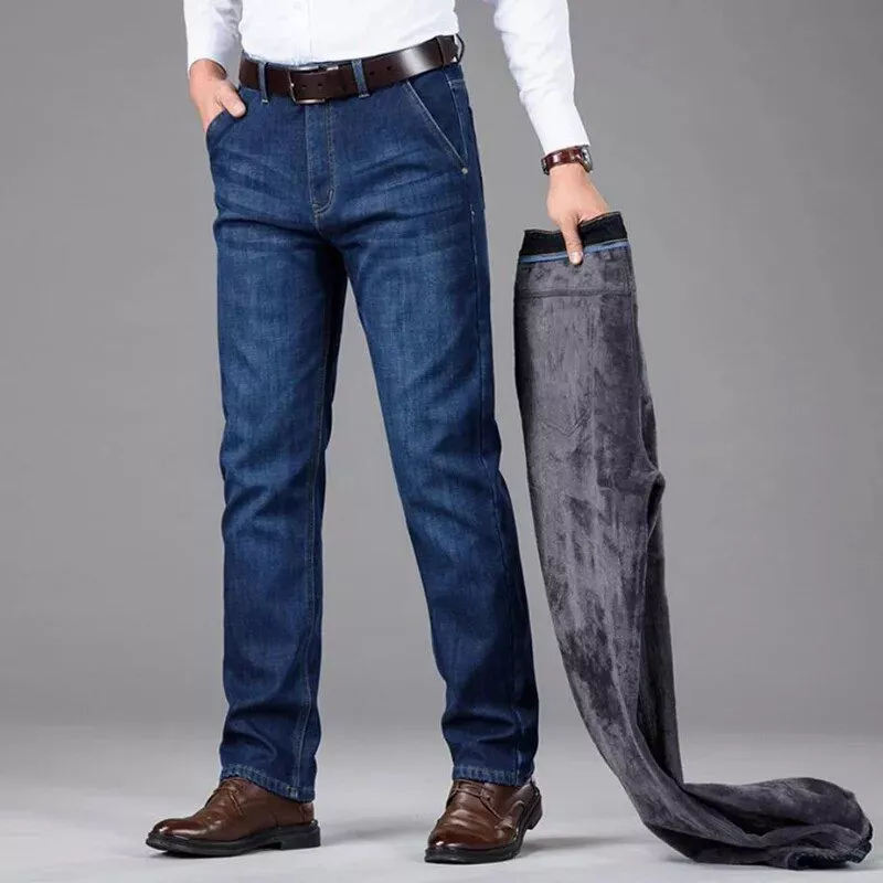Winter Warm Stretch Cotton Denim Jeans - Men's Smart Casual Fleece Lined Trousers