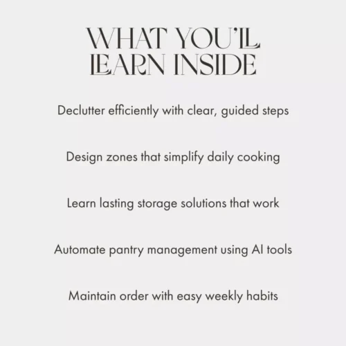 This guide is ideal for homemakers, renters, small-space dwellers, or anyone who wants to create a clutter-free, efficient, and stylish kitchen. Whether you’re starting from scratch or refreshing your system, this resource will help you save time, reduce waste, and enjoy your space more.