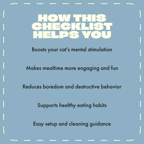 This checklist is ideal for cat owners who want to boost their pet’s mental stimulation, reduce boredom, and encourage healthy eating habits. It’s also great for anyone curious about using puzzle feeders for cats and looking for a simple way to get started with enrichment feeding.