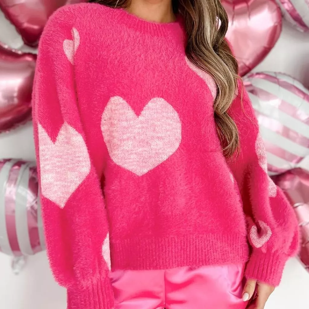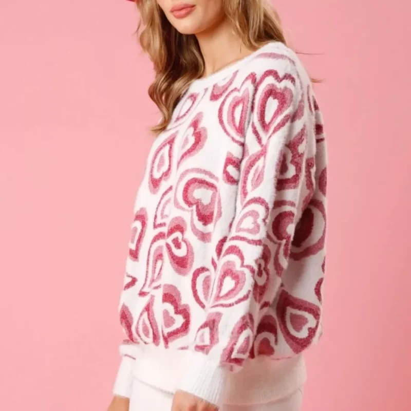 Our sweater stands out for its exquisite combination of comfort, style, and quality. The soft knit fabric provides a cozy feel, while the charming heart print adds a playful touch to your look. With its loose fit and slight stretch, it offers both comfort and versatility, allowing you to move with ease throughout your day.