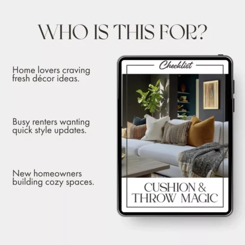 Home decorators, renters, interior design lovers, or anyone who wants to master how to style cushions and throws effortlessly. Ideal for staging homes, refreshing spaces seasonally, or simply enjoying a more stylish, comfortable living area.