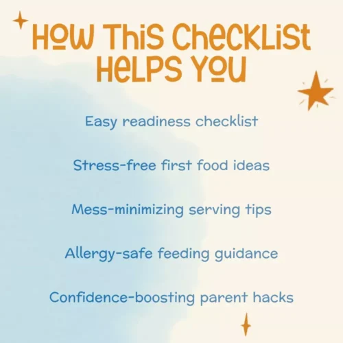 First-time parents, caregivers, and families eager to introduce solids in a safe, joyful, and stress-free way. Whether you’re exploring baby-led weaning or spoon-feeding, this checklist makes it simple to know where to start and what to try next.