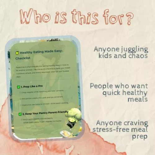 This checklist isn’t just another guide—it’s your shortcut to sanity in the kitchen. Download Healthy Eating Made Easy: Checklist now and discover just how effortless healthy living can be, even for the busiest families. Click “Add to Cart” to grab your instant digital copy today and start making small, sustainable changes that truly last!