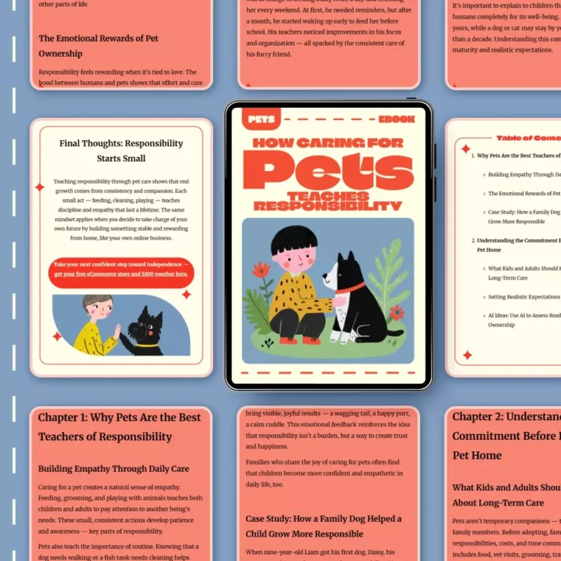 Unlike generic pet guides, this digital download blends emotional insight, family psychology, and modern technology to make teaching responsibility with pets engaging and sustainable. You’ll not only understand the “why” but also get the “how”—through AI-assisted routines, checklists, and interactive family activities. Every page is designed to help real families thrive through shared care and learning.