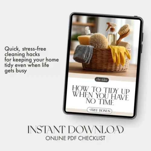 Stop feeling overwhelmed and start seeing results. Download How to Tidy Up When You Have No Time now and discover how to clean when you have no time—because even the busiest days deserve a clean, peaceful space. Click “Add to Cart” and get your instant digital checklist today!
