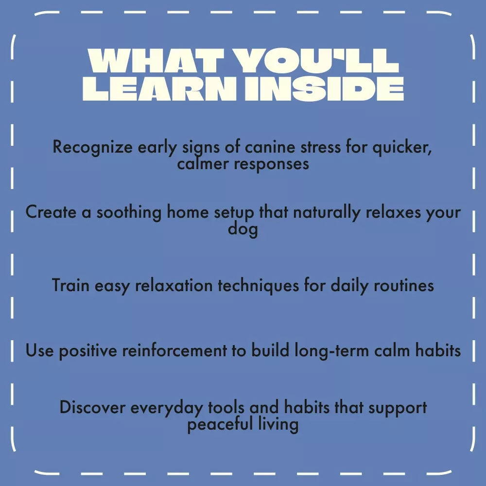 • Chapter 1: Understanding Your Dog’s Stress Signals — Learn to read body language, recognize behavioral clues, and uncover what really triggers anxiety.