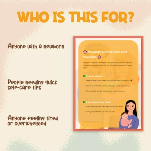 Unlike long parenting books that overwhelm you with information, this checklist keeps things short, sweet, and practical. It’s designed specifically for the early newborn stage, when energy and focus are limited. Every tip is bite-sized, doable, and tailored to fit into your daily routine—so you can actually use it without adding more stress.