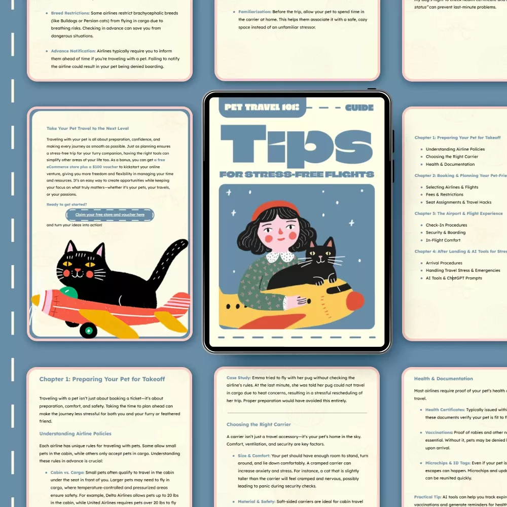 - Chapter 4: After Landing & AI Tools for Stress-Free Travel – Manage arrival logistics, handle pet stress, and explore powerful AI tools and ChatGPT prompts designed to simplify pet travel.