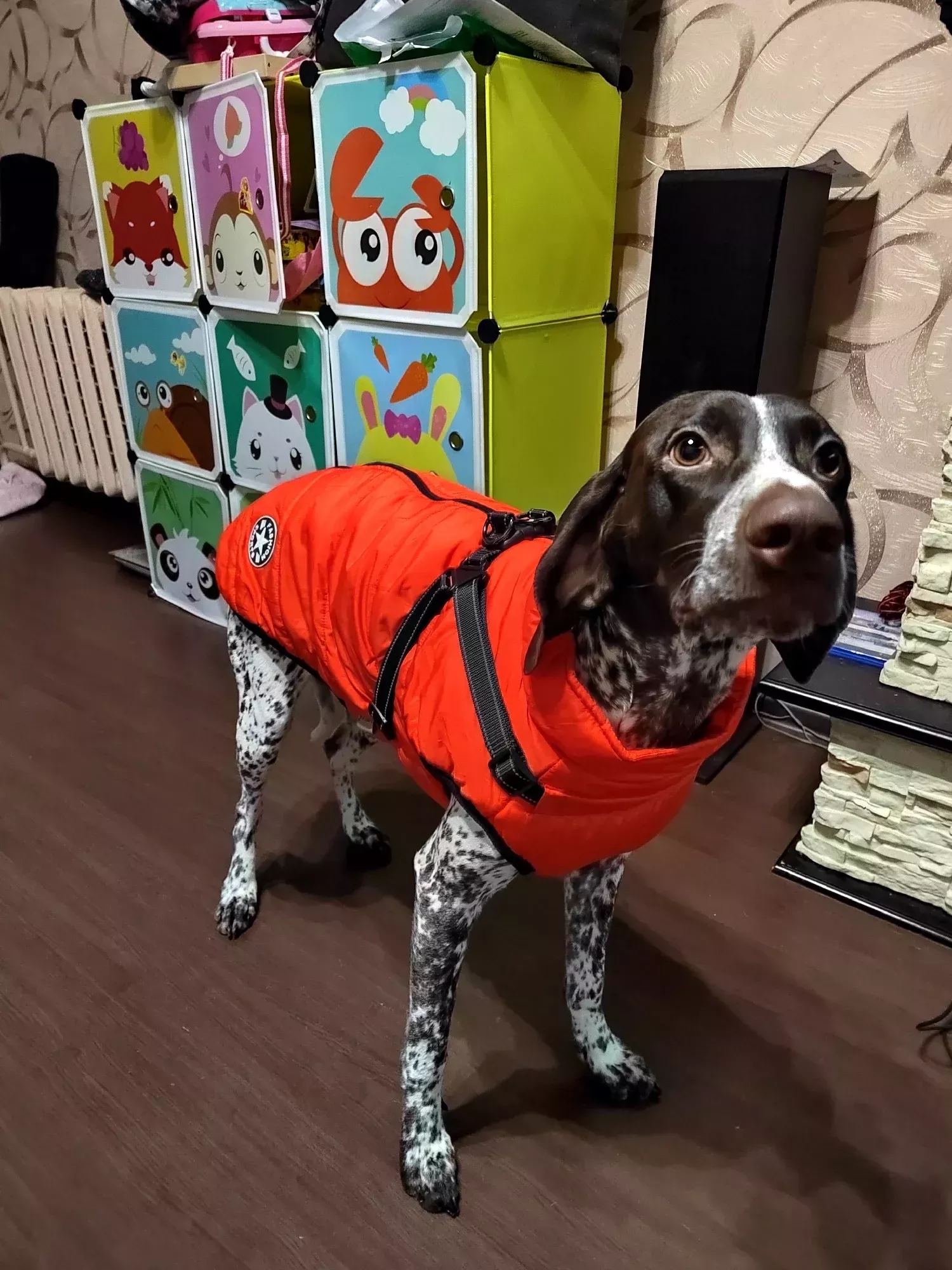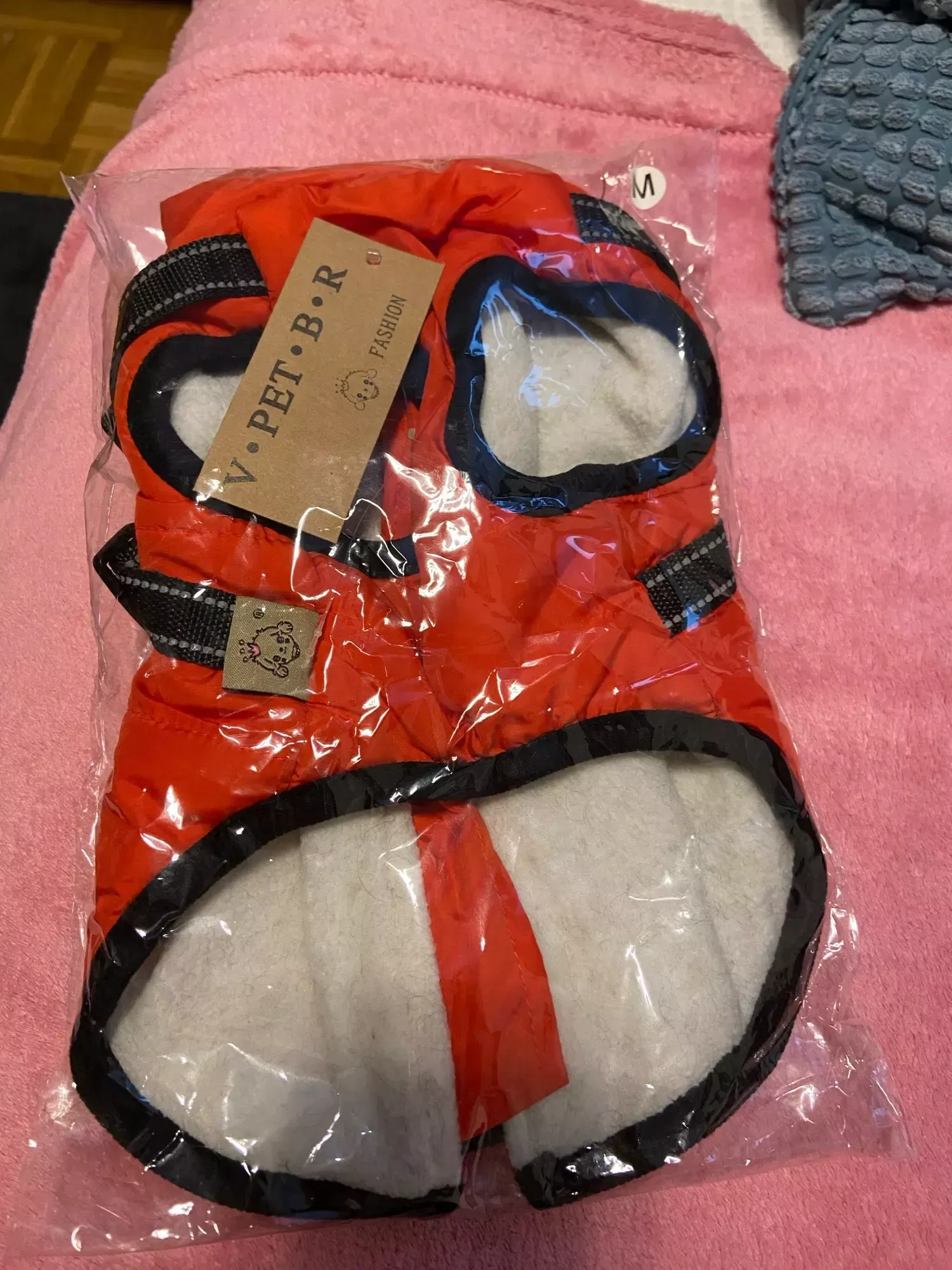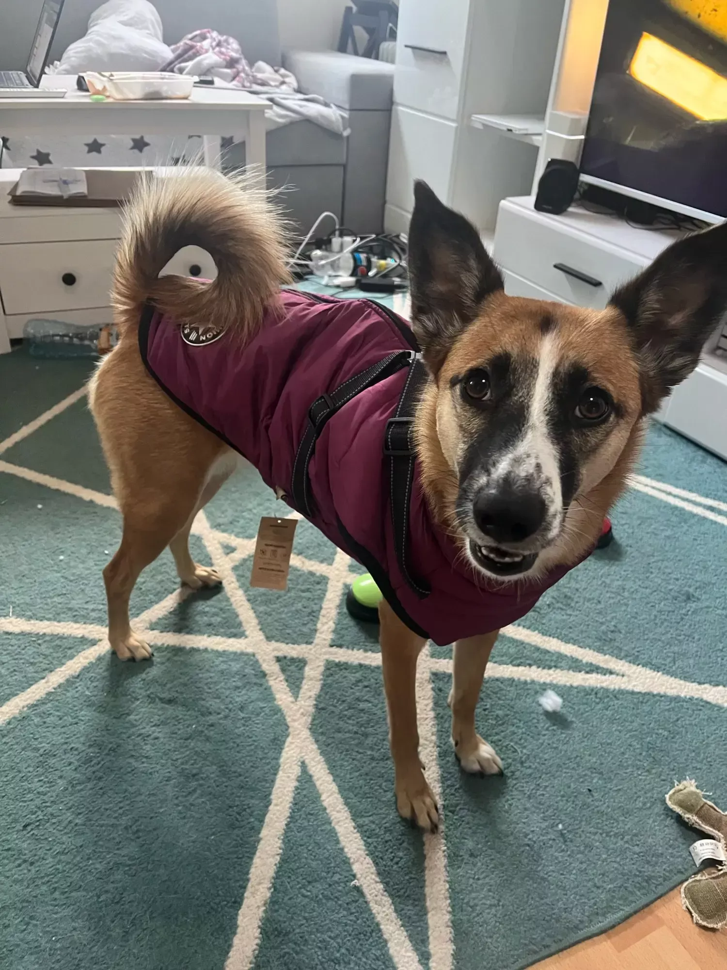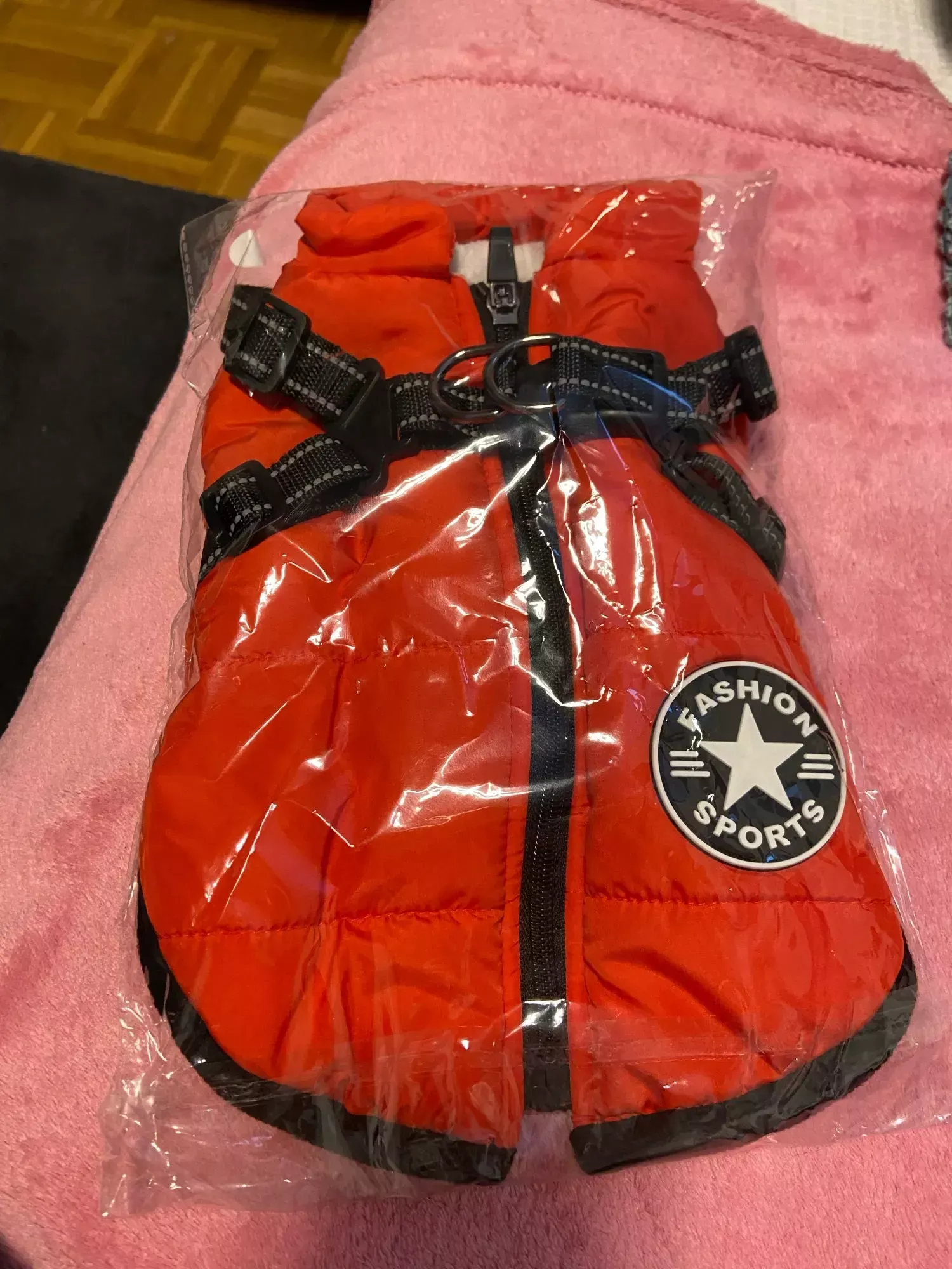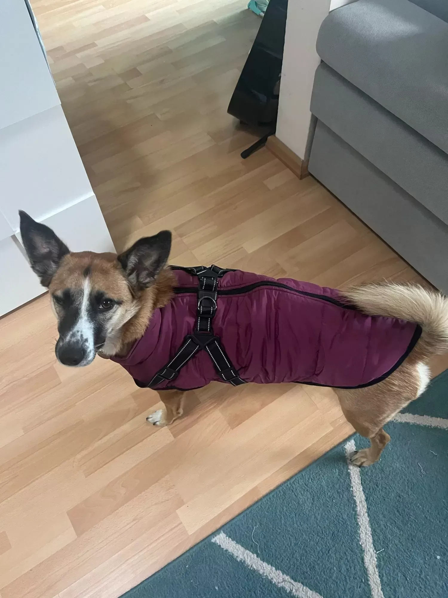 Excited for cold weather to use the new red jacket for our puppy.