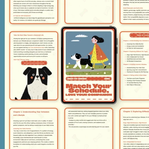 Choosing the right pet isn’t just about what looks cute—it’s about finding a companion that fits seamlessly into your lifestyle. Smart Pet Choices: Match Your Schedule, Love Your Companion is a thoughtfully crafted digital guide that helps you understand your daily rhythm, assess your availability, and make an informed, loving choice using practical AI tools. Whether you’re a busy professional, a student, or a family, this eBook gives you clarity and confidence before bringing a new furry—or feathered—friend into your home.