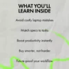 - Chapter 3: A clear breakdown of laptop specs like processors, RAM, storage, graphics, and battery life