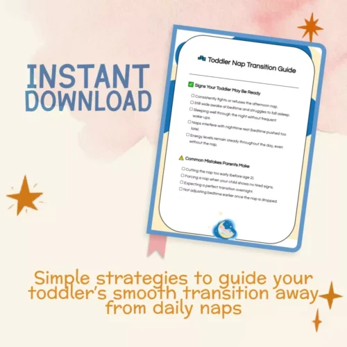 Is your little one starting to resist naps or staying wide awake long past bedtime? The Toddler Nap Transition Guide is a digital checklist designed to help parents recognize the right time and approach when wondering when should toddler drop afternoon nap. With clear signs, common mistakes to avoid, and practical transition tips, this easy-to-use guide brings clarity and confidence to parents navigating this tricky stage of toddlerhood.