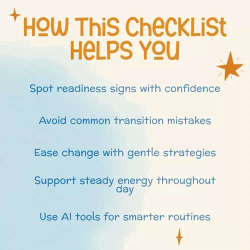 This checklist is perfect for parents of toddlers between ages 2 and 4 who are unsure about nap readiness, struggling with bedtime battles, or simply want a clear and supportive plan for transitioning from naps to full nights of sleep.
