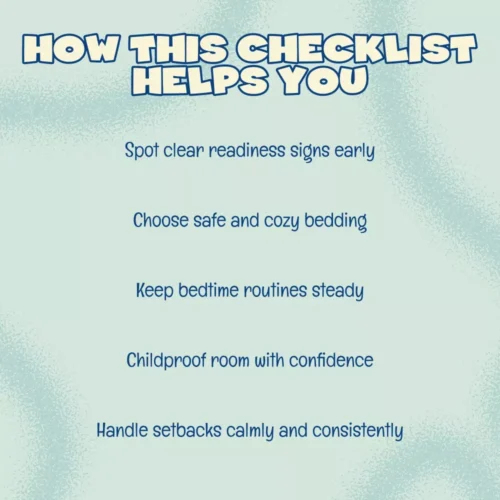 This checklist is designed for parents and caregivers with toddlers ready to move beyond the crib. Whether your child is climbing out of their crib, asking for a bed, or showing other signs of readiness, this guide gives you a structured, supportive approach.