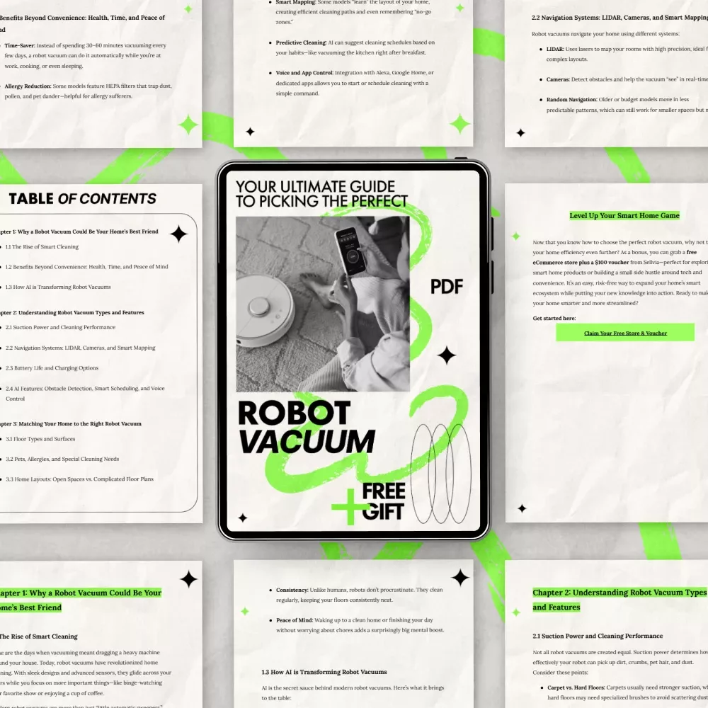 Choosing the right robot vacuum can feel overwhelming with so many models, features, and buzzwords on the market. Your Ultimate Guide to Picking the Perfect Robot Vacuum cuts through the noise and gives you clear, practical guidance so you can confidently choose the best option for your home. This easy-to-follow eBook is designed to help you understand what really matters, avoid costly mistakes, and invest in a robot vacuum that fits your lifestyle, space, and cleaning needs.